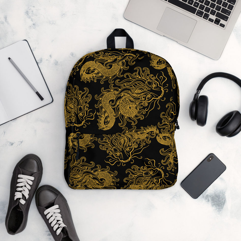Travel and commute in this statement dragon dance print on this medium size backpack in Black/Gold colorway. Whether you need for daily use going to class or matching your luggage set on route to your flight, it won't be boring. Backpack has plenty of room for all your necessities, while the water-resistant material will protect them from the weather.