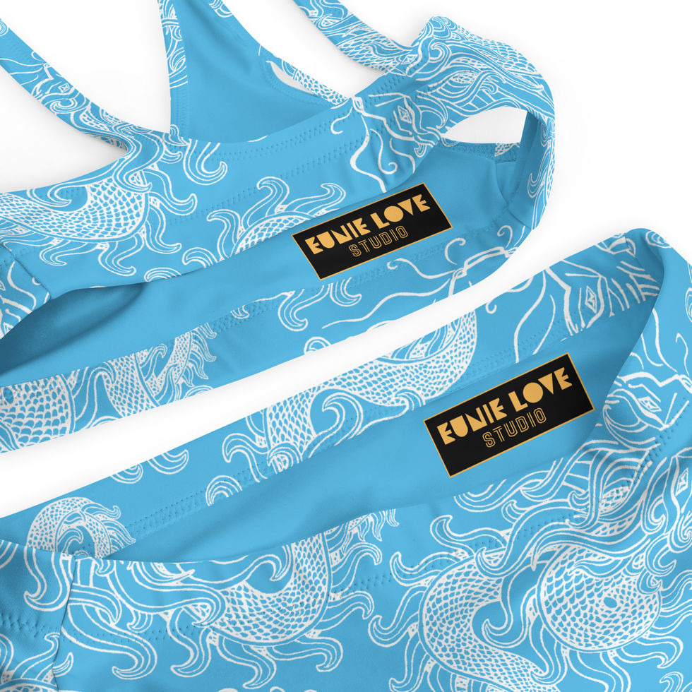 Discover the bold and unique Dragon Dance print by Eunie Love Studio on a high waist bikini set in Sky Blue colorway. It’s made from soft recycled polyester with double-layering and UPF 50+. Perfect to compliment your bold energy on your next poolside vacation or summer adventure. Complete and layer your look with a matching button up shirt.