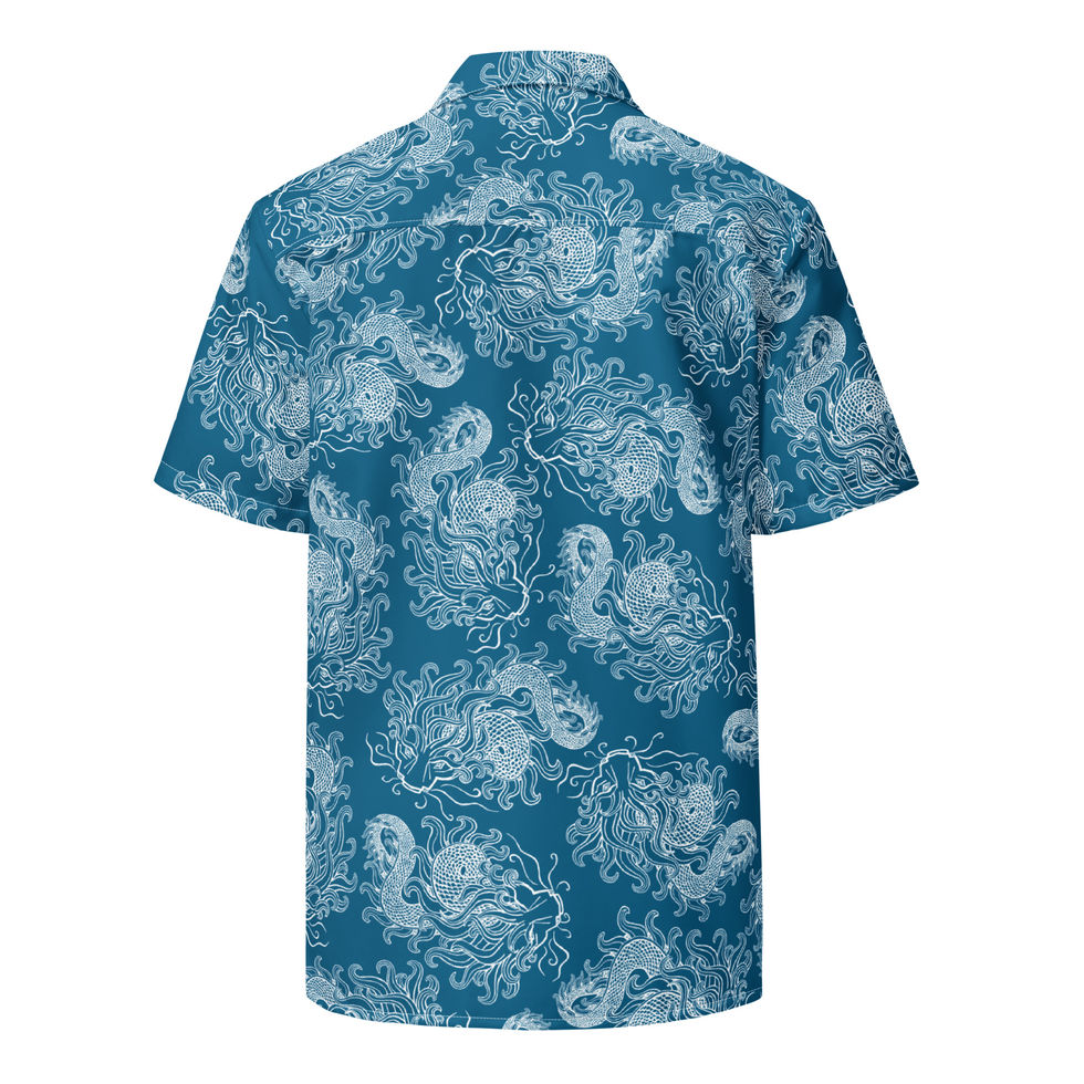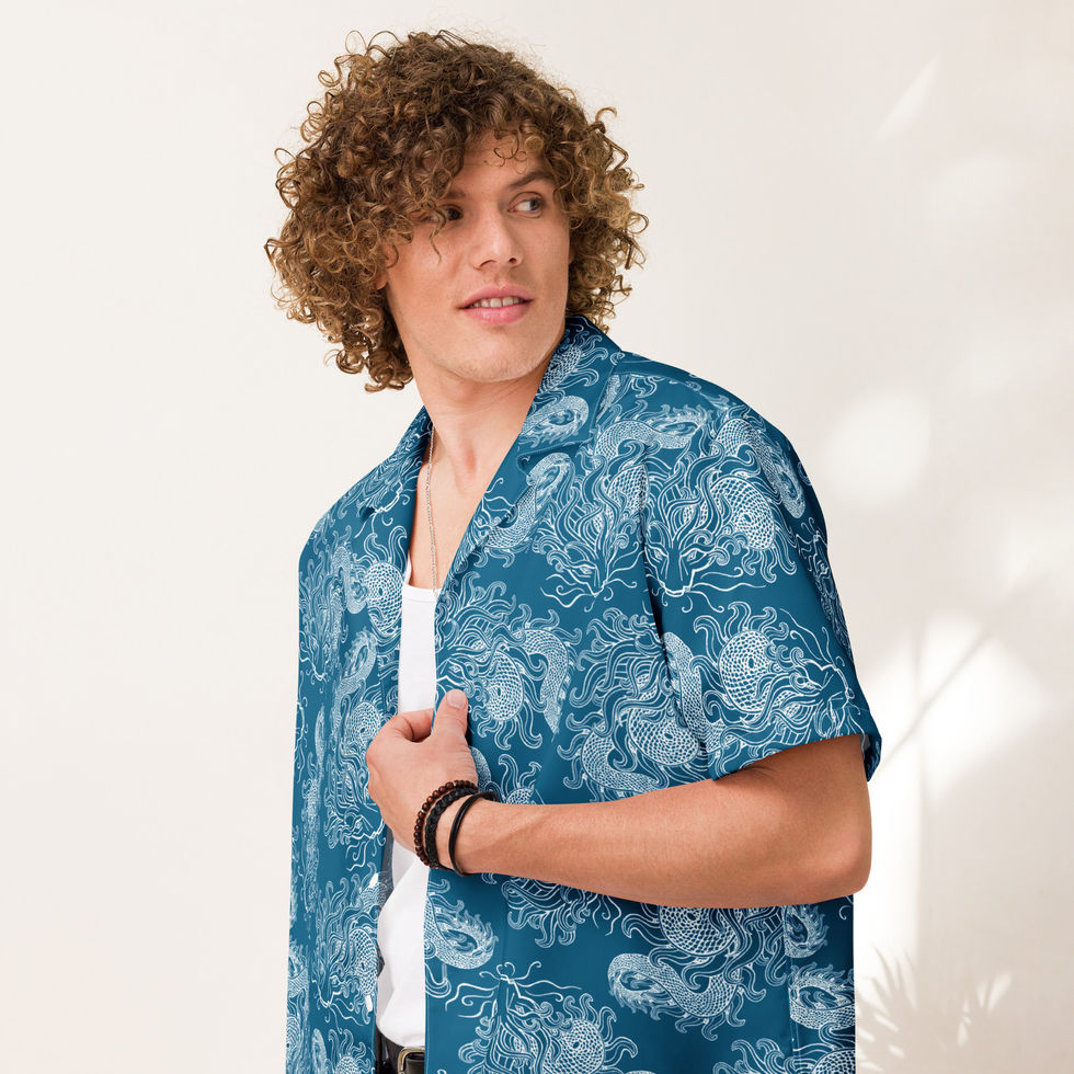 Discover the ultimate dragon print design by Eunie Love Studio in Blue Jay colorway. This short sleeve button shirt is made in light weight fabric with moisture-wicking properties perfect for poolside comfort and summer adventures.