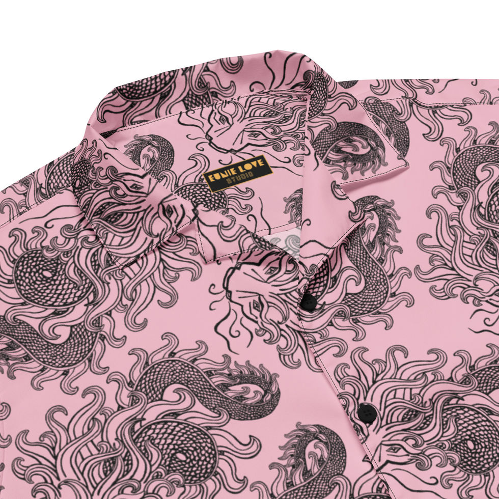Discover ultimate dragon print design by Eunie Love Studio in Blush pink colorway. This short sleeve button shirt is made in light weight fabric with moisture-wicking properties perfect for poolside comfort and summer adventures.