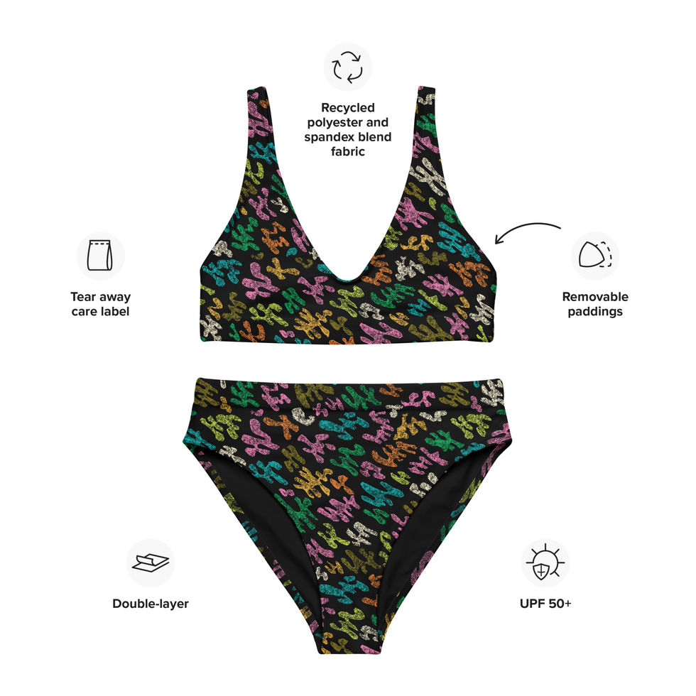 Stay comfortable this summer in this quirky Jiggy print high waist bikini set by Eunie Love Studio in Black Multi colorway. It’s made from soft recycled polyester with double-layering and UPF 50+. Compliment and layer your look with a matching button shirt to serve as a coverup. Perfect for all your summer adventures whether lounging by the pool or hitting up the beach.