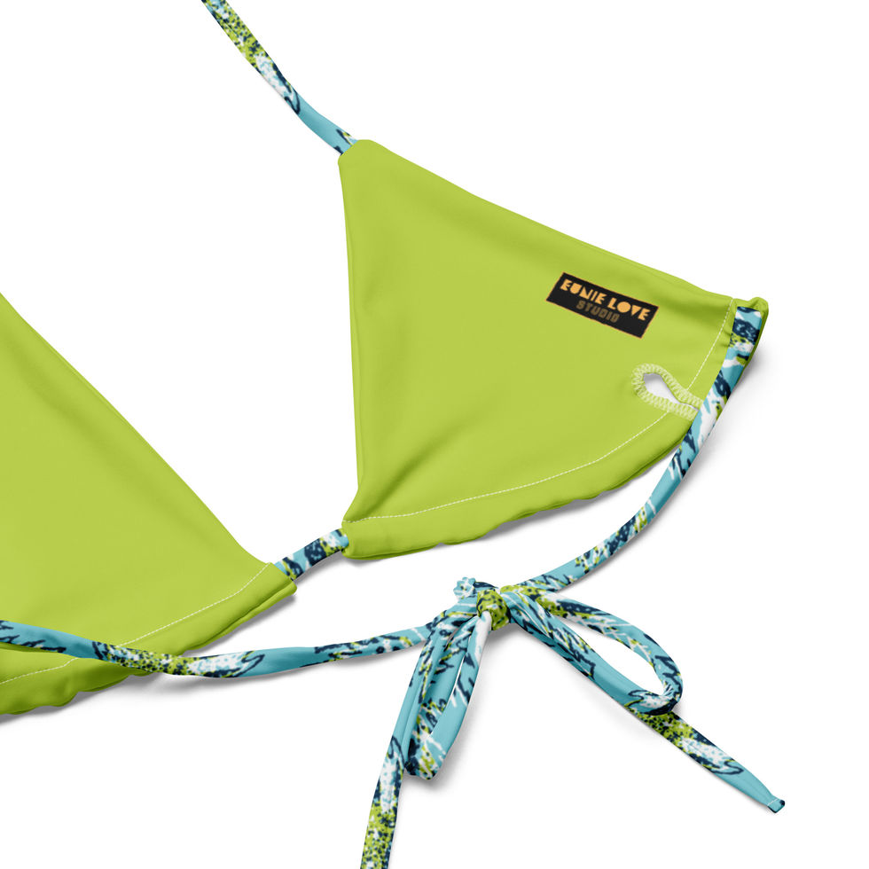 Stay cute in this tropical Leafy Tiki print string bikini by Eunie Love Studio in Aqua. This bikini set is made from double layers of soft recycled polyester with UPF 50+. Straps can be styled in a few different ways for versatile looks. Compliment and layer your look with a matching button shirt to serve as a coverup. Perfect for all your summer adventures whether lounging by the pool or hitting up the beach.